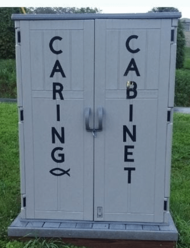 This cabinet sits in our parking lot and is open 24/7. If you need something – take it. Have food to give? – leave it (non-perishable only). Have a friend in need? – take them some.